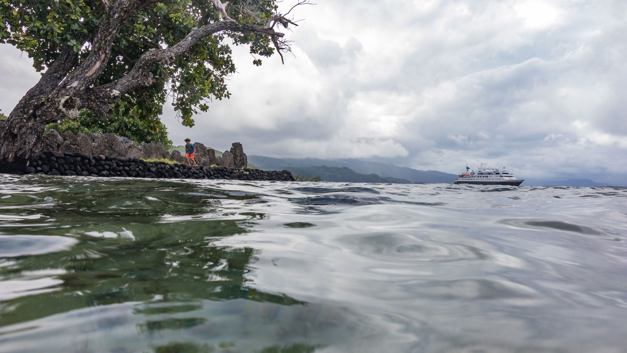 Dawn’s sunlight cracks across the sky in a fiery blaze as National Geographic Orion departs from its anchorage in Taha’a, heading towards Ra’iatea. Spinner dolphins quite literally leaped for joy welcoming us into the harbor and put on quite the display twirling through the air, riding on the ship’s bow, and darting in the water. The divers went out for a fish-filled dive as others took to a dry landing onshore. We explored the sacred grounds of the Marae Taputapuatea complex, gathering to see the stone structures that united a vast sea of distant islands. In the afternoon, we navigated east, towards our next stop in the Cook Islands.