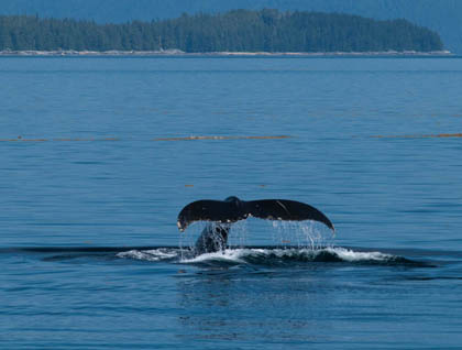 Making our way north through Chatham Strait we had brief glances at some Dall’s Porpoises. As Steve MacLean began his presentation “Forest Ecology of Southeast Alaska” we got the word. Humpback whale! Out to the decks we went to watch one, then two then three of these huge animals as they came to the surface to breathe and then showed their flukes as they dove for more food. After this wonderful show, Steve resumed his informative presentation.