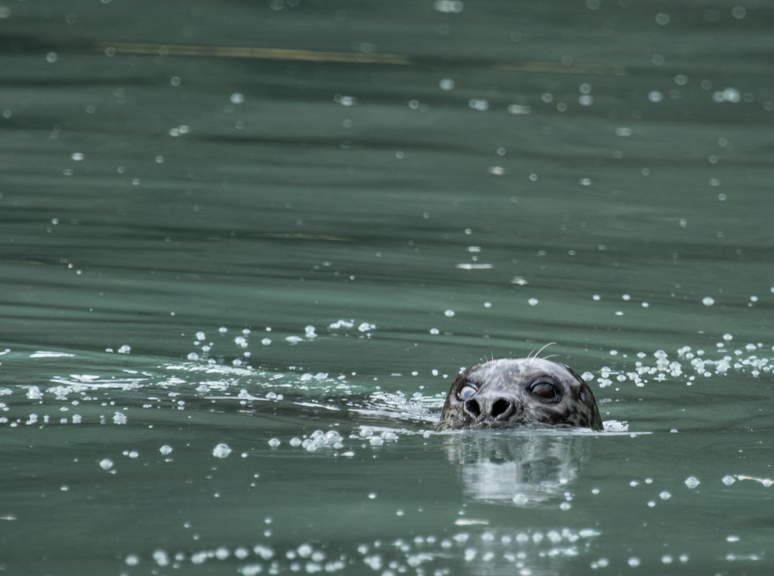The remainder of the day was a superlative taste of adventure spent in the turquoise waters of Takatz Bay. Not only was the sky clear, but, the sun was out in full force which was much appreciated by the multitudes of kayakers and hikers. We arrived during high tide and by the end of the afternoon the far end of the bay revealed an abundant salmon stream as well as an exposed mud flat, which was covered in gulls feeding on the recently deceased salmon. The kayakers as well as expedition landing craft cruisers had numerous sightings of harbor seals devouring the incoming salmon. The hikers, or better yet, “bushwackers” followed a fresh bear trail into the depths of the forest where one of the seasoned naturalists claimed to have seen the largest western hemlock of his life.