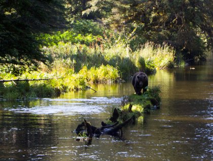At sunrise, we entered the incredibly scenic bay of Red Bluff Bay, and found our first bears of the day. Three distant bears were feeding on salmon, while many bald eagles were perched on the snags around them. Behind us, a massive waterfall plunged into the sea, and we were able to approach in the ship to within a few feet of it. Early morning light on the surrounding high peaks finished the scene for our pre-breakfast pleasure.
