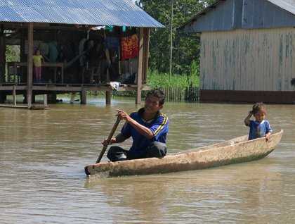 This morning after breakfast we got a firsthand view of yet another reason why canoes are important—many of the towns along the river flood for 3 - 4 months of the year. We visited one such village, Urarinas, this morning. On our visit today we drove our skiff over  the top of the soccer field, down the various streets, and stopped to shop for local crafts. One local man came by in his canoe to show us the three-foot-long electric eel he had caught. Nowhere was there dry land.