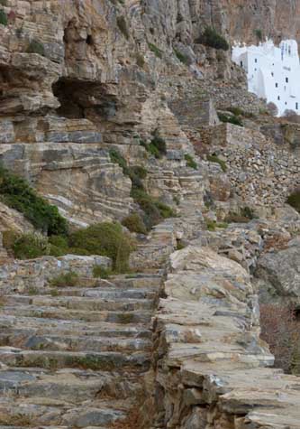 Local buses drove us up and over the island and after a scenic ride we stopped at the bottom of a very steep cliff. The monastery of the Virgin Mary Khozoviotissa “crowns” the cliff, as it is seems to be glued onto the side! We had a good hike of 360 steps up, but that’s the only way to see how the 11th century monastery was built. The foundation stone was placed after locals found a floating icon in the water. It was considered a sign by Virgin Mary, so they built a place of worship that became one of the most important monasteries during the Byzantine times. This monastery is by far one of the most spectacular ones in Greece.