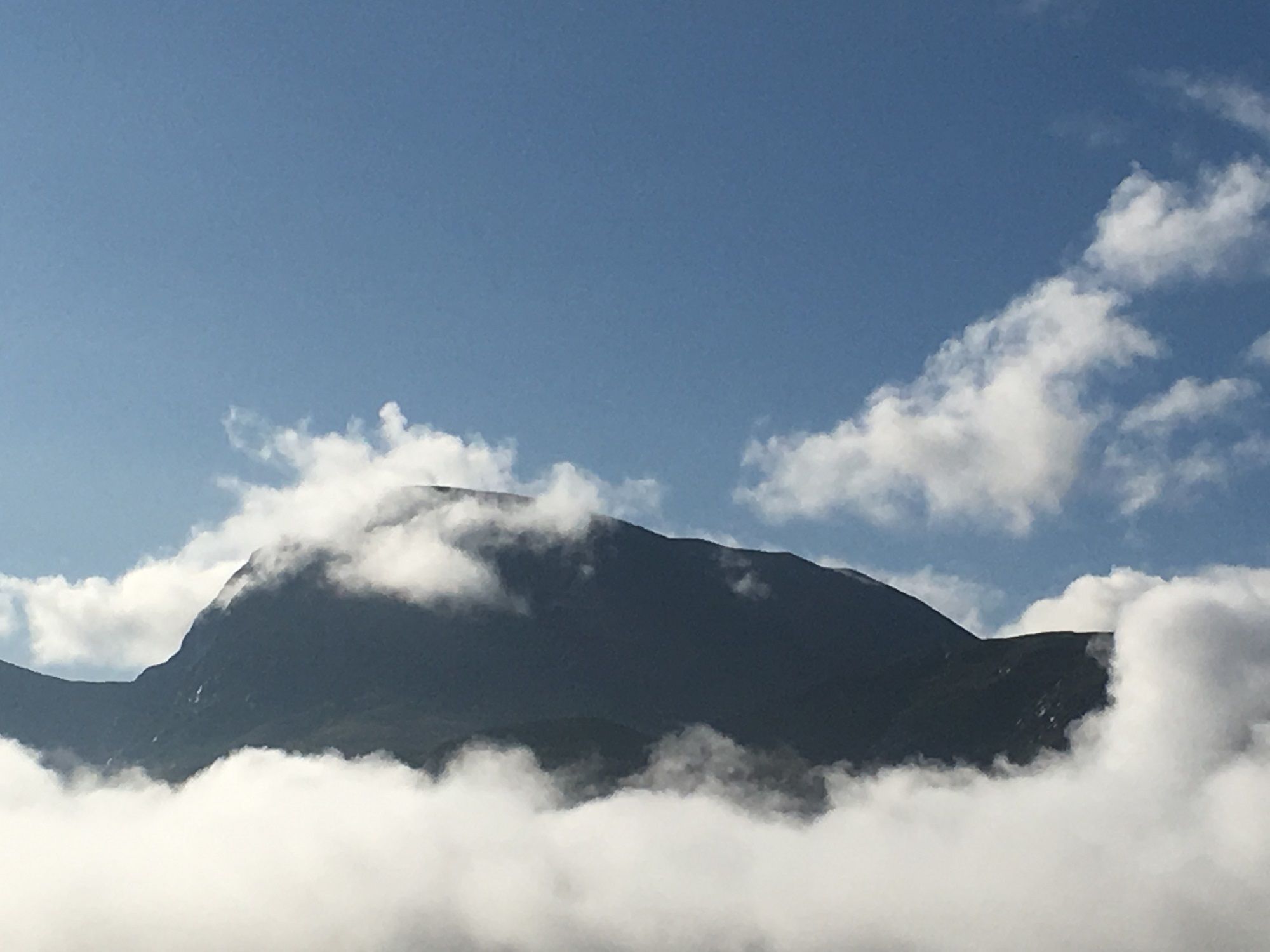 The mist soon cleared, leaving intriguing wisps of clouds around the base of the mountains. And from then on we had a day of pure sunshine. The reflections of the heather-covered hills in the canal were out of this world.