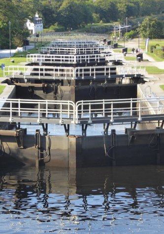 After travelling through two locks we passed the swing bridges for the trains and vehicles and then ascended Neptune’s Staircase. This is a staircase lock with eight locks, raising the water level by 64 feet, an amazing feat of Victorian engineering.