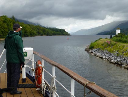 With the occasional spit of rain and sunny spells we enjoy Lord of theGlen’s journey along the winding course of the Caledonian Canal. This takes us to the last of the hand-operated bridges, Moy Bridge, and then onto Gairlochy Locks. Once on Loch Lochy, Konia gives us an informative (if I may say so myself) talk on Highland life and clothing, including the patterns—the TARTAN.