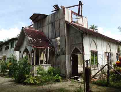 It’s hard to imagine today that Samarai Island was once a bustling trading port and resupply center for ships travelling between Australia and the China.  In fact, this tiny island was once the capital of the Milne Bay Province and held the second largest city in Papua New Guinea.  We landed right after breakfast and were entertained with a sing-sing, the traditional welcome given esteemed guests.  The island market was open during the morning, so we also had a chance to check out various food items, as well as handicrafts.  While some spent the morning below the water’s surface exploring China Strait just offshore, most of us took the time to wander about this historic place.  The town, now in ruin, once held attractive colonial buildings, churches, stores, a hospital, schools, waterfront warehouses, hotels and inns, beautiful homes, a cricket field, and even a movie house. At the onset of the War in the Pacific (1941 to 1945), Samarai was evacuated and many of the buildings were destroyed, so invading Japanese forces could not simply move in to a perfectly good town.  As it turned out, Japanese forces didn’t make it to Samarai, but when the war ended, Samarai never regained its earlier importance.  The provincial capital was moved to Alotau on the New Guinea mainland and Samarai was nearly forgotten.  Life is much slower paced nowadays and the people who live here are decidedly poor.  Many of the houses seem somewhat dilapidated, but it was interesting to note that the majority of trees and shrubs give forth healthy foodstuffs, including coconuts, breadfruit, papaya, mangoes, tropical almonds, guava, citrus, pandanus, taro, noni fruit, etc., and fish are free for the taking just offshore.  So, in spite of the poverty, the populace appears very healthy and happy.