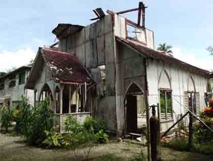 It’s hard to imagine today that Samarai Island was once a bustling trading port and resupply center for ships travelling between Australia and the China. In fact, this tiny island was once the capital of the Milne Bay Province and held the second largest city in Papua New Guinea. We landed right after breakfast and were entertained with a sing-sing, the traditional welcome given esteemed guests. The island market was open during the morning, so we also had a chance to check out various food items, as well as handicrafts. While some spent the morning below the water’s surface exploring China Strait just offshore, most of us took the time to wander about this historic place. The town, now in ruin, once held attractive colonial buildings, churches, stores, a hospital, schools, waterfront warehouses, hotels and inns, beautiful homes, a cricket field, and even a movie house. At the onset of the War in the Pacific (1941 to 1945), Samarai was evacuated and many of the buildings were destroyed, so invading Japanese forces could not simply move in to a perfectly good town. As it turned out, Japanese forces didn’t make it to Samarai, but when the war ended, Samarai never regained its earlier importance. The provincial capital was moved to Alotau on the New Guinea mainland and Samarai was nearly forgotten. Life is much slower paced nowadays and the people who live here are decidedly poor. Many of the houses seem somewhat dilapidated, but it was interesting to note that the majority of trees and shrubs give forth healthy foodstuffs, including coconuts, breadfruit, papaya, mangoes, tropical almonds, guava, citrus, pandanus, taro, noni fruit, etc., and fish are free for the taking just offshore. So, in spite of the poverty, the populace appears very healthy and happy.