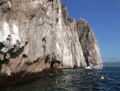 It was time to get back to the National Geographic Islander to move on to the next destination, Leon Dormido, a volcanic formation. This place is the home of some species of sharks and this is the place where our guests are going to do snorkeling. Once in the water it is nice to get close to the walls because there is submarine life that has adapted to this environment, growing barnacle and starfish. Different kind of fish, turtles, and sharks can be seen here.