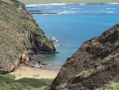 As we followed Charles Darwin’s steps with San Cristobal being the first island that he visited, our morning outing took place at Punta Pitt. It offered an impressive and bizarre volcanic landscape that has been shaped overtime by the elements. This is one of the only few sites in the Galápagos where we can sometimes find all three species of boobies nesting together. A Zodiac ride to a nearby island blew our mind; tropic birds, storm petrels, swallow-tailed gulls, Nazca boobies, frigate birds, shearwaters and many more species of sea birds were found in not more than 400 square meters in surface area. The landing was in an incredible green sand beach where sea lions and marine iguanas welcomed us. The small canyons that we used as a path took us to a plateau and viewpoints where we were able to sight red-footed boobies with their chicks. In addition, mocking birds, lava lizards, and scalesia trees, which are endemic to this unforgettable place, were spotted. The walk ended on the beach, where we had a pleasant swim in very warm waters.