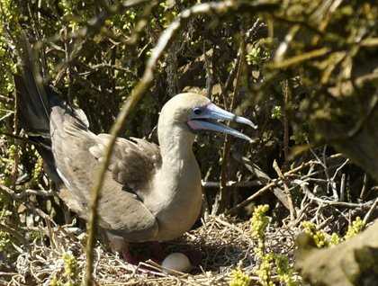 We took our last hike at the northeastern end of this large island at a site named Punta Pitt, an old tuff cone with impressive cliffs. The hike follows along a dry stream bed, and once you reach the plateau covered with patches of red Sesuvium the view is fantastic. The trail offers one the most dramatic landscapes around the Galapagos and it’s one of the few places in the Galapagos where you can see a colony of red-footed boobies nesting. These boobies are the only ones among the three species found in Galapagos that nest in trees and bushes along the cliffs. Today we had the opportunity to find some close enough to the trail, and some of them on their nests with chicks and eggs.