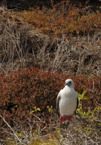 Today is our last full day! The National Geographic Islander dropped anchor early in the morning. We first went ashore to visit Punta Pitt, the most Southeastern site of Galapagos. Due to its location facing open seas, this place has a large colony of red-footed boobies.  They feed far out in the sea and return home to Punta Pitt to tell fish stories to each other. After an easy wet landing on an inorganic beach that seemed to be made out of emeralds and getting into walking shoes, the hike began.  We climbed a long, steep, narrow creek, trekking almost 300 feet.  Once on top, the walk became easier.  This place is dry and the plants that grow here are small, yet beautiful, adding touches of red and purple to this jagged landscape. Along the way we found marine iguanas and nests where some eggs had been laid.  We also found some red-footed boobies on their nests, sitting on their eggs! It was a hot day, so most of us went in the water after the walk and a male sea lion decided to join the group.  Fun!