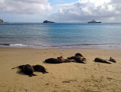 At the end of the morning, we returned to the National Geographic Endeavour and started to navigate towards Leon Dormido. This islet offered a great opportunity to have a more adventurous snorkeling, as it is far off of the coast and surrounded by deep waters. During the snorkeling outing, some of our guests encountered hammerhead sharks, Galapagos sharks, green sea turtles and many different species of fish. After snorkeling, we navigated around this islet with the ship and observed the always impressive cliffs and the many birds that nest here.