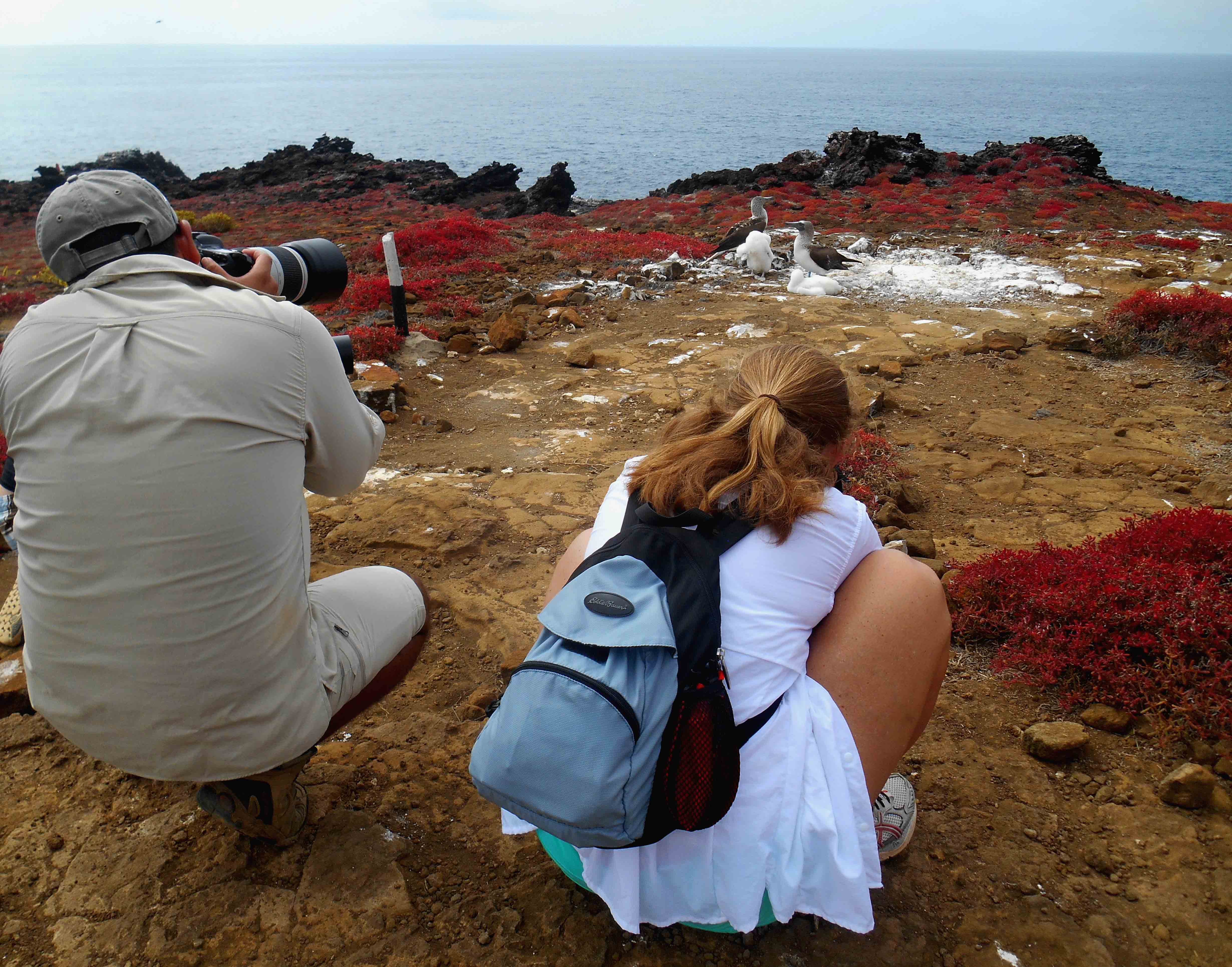 Early in the morning, we visited Punta Pitt, an astonishing walk which goes along a dry stream bed and then leads up towards a gorgeous plateau with several viewpoints. This site is the only place in the Galapagos where we are able to witness the three different species of boobies: the blue-footed booby, the Nazca booby and the red-footed booby. During the last years, the number of red-footed boobies and blue-footed boobies in this site has increased. This is the result of the constant efforts of the Galapagos National Park to control introduced species on the islands, such as cats and rats. We witnessed several nests with healthy chicks and caring parents, demonstrating that this ecosystem is healthy and thriving. With the contribution of responsible visitors to the Galapagos, we can improve this kind of positive result and hopefully eradicate alien species from this site. Although this is our last day, the feeling of excitement and awe keeps growing every time we walk just a few feet from the nest of so many birds, which show such a unique fearlessness.