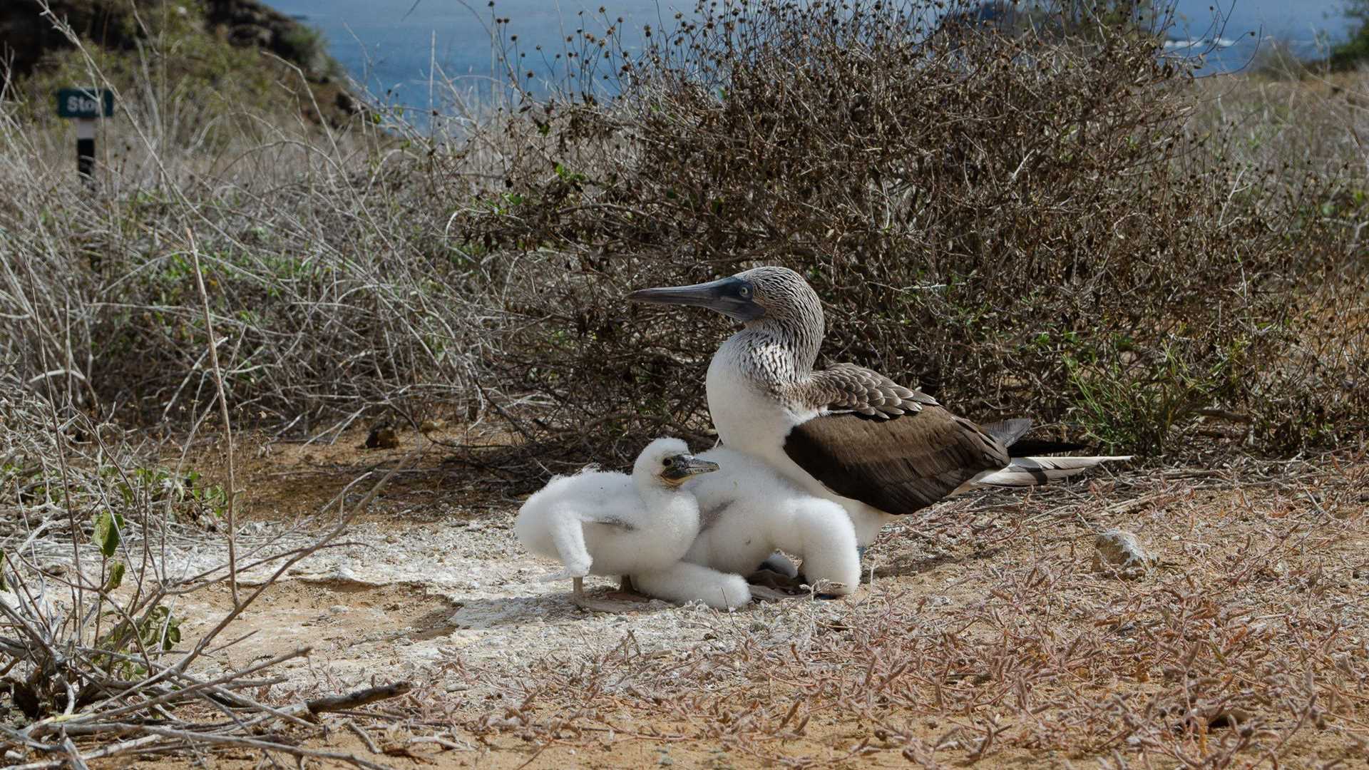 The landscape at Punta Pitt is breathtaking. The tuff cones are huge and have been eroded in a completely different way from other cones—they look like spikes on the back of an old dragon. As we walked up, we found various endemic lava lizards and a few finches, but nonetheless the highlight of the walk was to see several blue-footed booby pairs with chicks of all different sizes. Some were just a few weeks old, and some were bigger than their parents, but all of them looked very healthy. It is a relief to see that these beautiful birds are coming back to nest on this site.