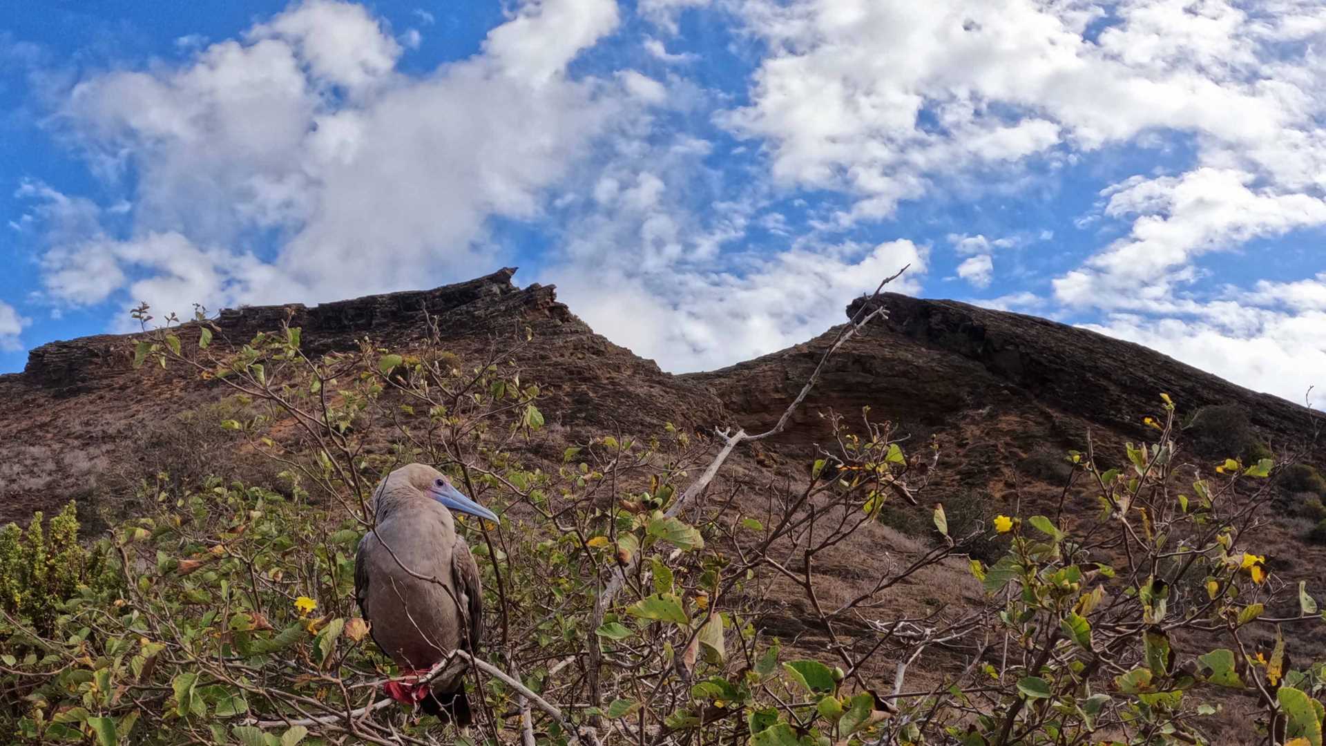 Punta Pitt also has impressive scenery from up above. We observed clear and cloudy skies, and the inversion layer kept us cool and pleasantly comfortable during our walk. All our senses were heightened as we listened to our surroundings while searching for red-footed boobies. We were lucky to see them very close.