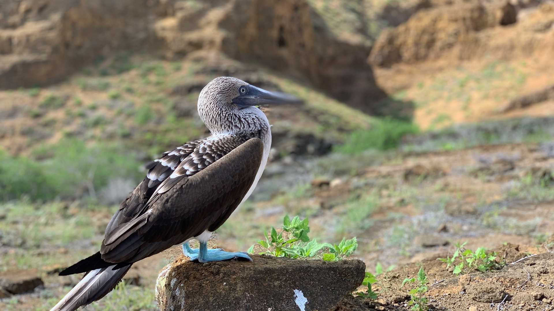 After breakfast, we boarded the Zodiacs and headed towards the landing beach. The sun was shining, and the ocean was very calm. In the air, blue and red-footed boobies and frigatebirds began their daily routine of flying over the island in search of food. We started our walk along the narrow trail, which led us to the top of Cerro Pitt. As we ascended, the vertical slopes of the hills showed us the remains of ancient waterfalls, formed during past rainy seasons or during past El Niño phenomena.