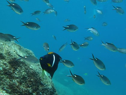 We spent the afternoon at Isla San Francisco. This small island is one of the most scenic of the region and has a wonderful white sandy beach. Its turquoise waters make this place unforgettable. First we snorkeled along the rocky shoreline and discovered a wonderful hidden world under the surface. Large schools of grunts lined the bottom. A good diversity of fish was seen. Some of the most attractive species were the king angels, the balloon fish, reef cornet fish, giant damsels, sergeant majors, and goatfishes. The clarity of the water was very good and the temperature was quite pleasant as well. This snorkeling outing was certainly a good way to start our journey