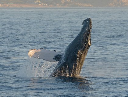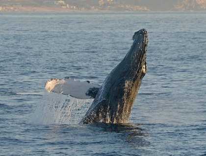 A gentle rolling and a star-filled night describe our passage south to the very tip of the Baja California. Soon we rounded Land’s End and gazed upon Cabo San Lucas and a glacially sized cruise ship. Off in the distance a humpback whale breached and drew our attention to more natural sights. Finding a predictable animal gives quite an advantage to photographers when trying to get a shot of a 45-ton creature throwing itself into the air. This humpback breached about every two minutes as we passed and is featured in today’s Daily Expedition Report photograph. There are over one thousand humpbacks that breed and calve from here to the Mexican mainland and out to the Revillagigedo Islands south of Baja California. February is an excellent time to watch competitive groups of males in a variety of behaviors.