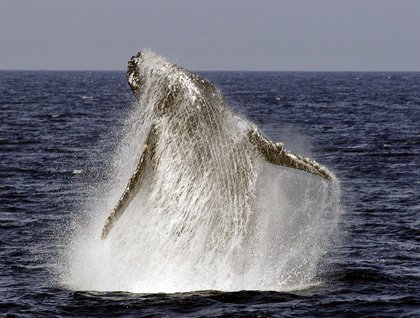 After lunch we traveled east past numerous distant blows from humpback whales. Several groups of bottlenose dolphins passed, and a few hitched a ride on our bow wave. Far ahead, two humpbacks breached. They became our destination. Males from the Revillagigedo Islands farther south often pass through here as they make their way north. Breaches and other displays may be for a chance to gain access to a nearby female with her calf guarded by an escorting male. For whatever reason, we were in the perfect place to watch these two athletes take their 40-ton bodies and leap spectacularly into the air. Today’s daily expedition photo shows water streaming off the sides as one of the animals erupts from the calm surface. Later we found another group with four animals performing high-energy displays. One consistently leaped with high, arching chin breaches and was followed by another that surfaced with its mouth and throat distended with water. Two more came in closely behind. At first there was little fanfare, and then they all seemed energized and speeded up, sometimes executing chin breaches side-by-side. The water seemed to boil with the strokes of their powerful flukes. We were, of course, mesmerized by the activity. All of our guests and many crewmembers watched from the bow and along the rails as the whales passed quite close to our ship. This spectacular activity didn’t consume our afternoon it devoured it.