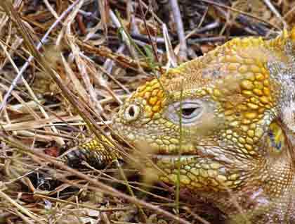 After a few hours of navigation, we dropped anchor in the early morning at Cerro Dragón, or Dragon Hill, located in the northern coast of the Santa Cruz Island. It is hard to believe that this is the same island that we explored a previously, as the landscape at this site is brown and arid instead of lush and green! The trail led us inland into the territories of one of the last remnants of a once large population of Galápagos land iguanas. This endemic species has been severely decimated in the last hundred years due to predation by introduced carnivorous land mammals like rats, cats and dogs. We are well into the dry season now, and therefore the local vegetation has decayed, creating a yellowish mantle on the area. And since the land iguanas are yellow as well, this became a bit of a difficult search, but we were ultimately successful. As the ground and air warmed up, the iguanas started emerging from their boroughs, to soak up in the sun and find their food. In addition to the land iguanas, we also enjoyed observing the other local inhabitants, like the Galápagos mockingbirds, marine iguanas, yellow warblers, herons and a solitary greater flamingo feeding in a brackish lagoon. We returned back on board and our ship changed position to be nearer to Guy Fawkes, a group of small islets not far from Dragon Hill. Here, some of our guests chose to take a Zodiac ride along its shoreline, where many seabird species next, like blue-footed and Nazca boobies, brown noddies, swallow-tailed gulls and Galápagos shearwaters. A couple of American oystercatchers were busy piercing the barnacles, while a few sea lions enjoyed a very, very long siesta on the rocks. Guy Fawkes is also a spectacular snorkeling site, with its deep wall covered in colorful marine invertebrates. Because of the surrounding deep waters, it is a highly productive area with many fish species, some of them rather large, like the giant manta ray that accompanied our snorkelers for a while.