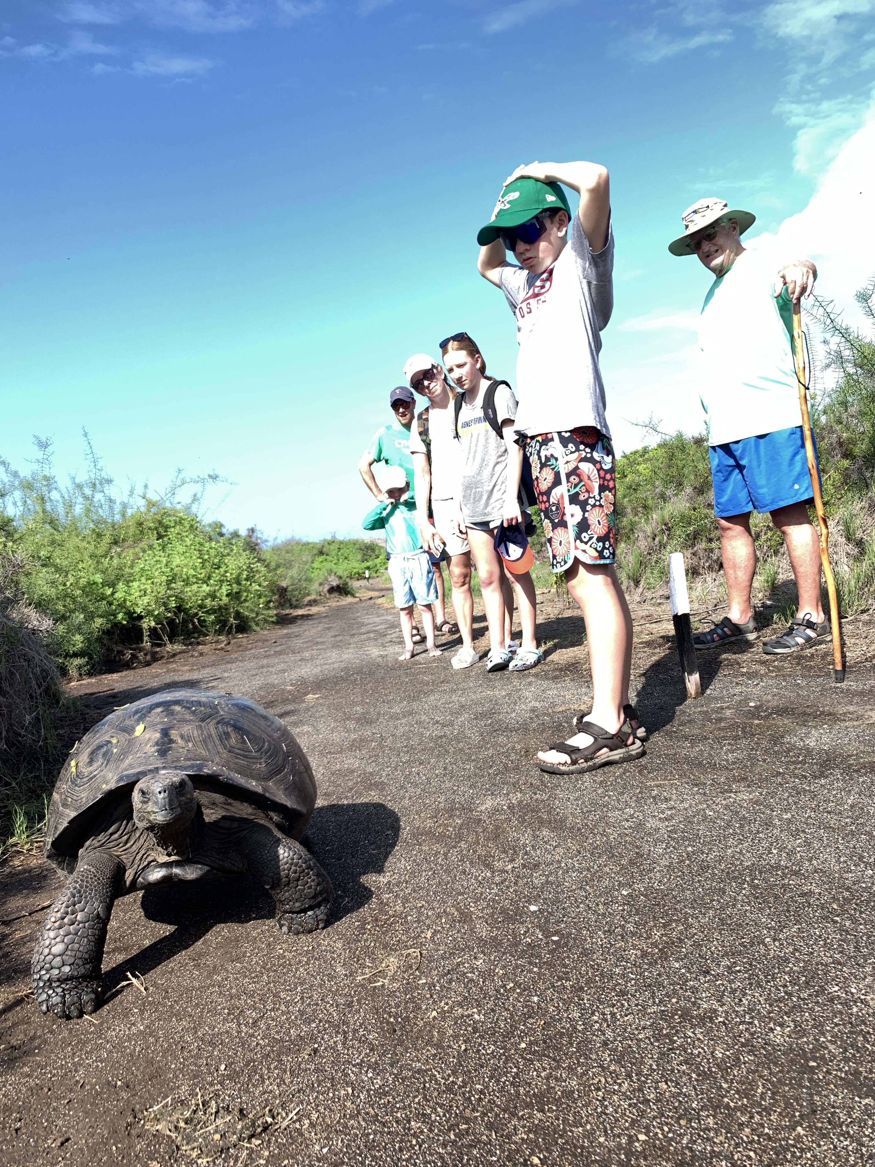 We are getting closer to the end of an awesome and unforgettable week in the Enchanted Islands of the Galapagos. We anchored early in the morning at “La Tranca,” a stop for many liveaboard yachts and boats near the Itabaca Channel. After a ten-minute Zodiac ride, we boarded a bus for Manzanillo Ranch, a productive and privately owned farm. As we traveled south, we had the chance to appreciate drastic changes in vegetation. We moved from a coastal, arid zone to a more humid, mist-covered one dominated by Scalesia trees, which are endemic to the Galápagos. Santa Cruz is the only island with six delineated vegetative zones. We noticed the contrast of natural and agricultural land. Finally, we came across the famous giant tortoises! We observed a wide-range of ages, and we were amazed by the tortoises’ appearance. We learned about their lifestyle, their natural history on the islands, their ecological importance, and their interactions with humans. We enjoyed a presentation on the human history of the Galápagos Islands by Omar. Back onboard National Geographic Endeavour II, we headed to Bowditch Bay for some time on the beach.