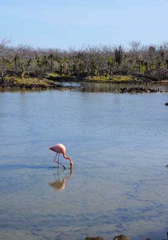 This morning we arrived at the northwestern coast of Santa Cruz Island, where we went ashore to have a hike on Dragon Hill. This is a very special place as it is part of a restoration program for Galapagos land iguanas. These reptiles almost disappeared when feral dogs were introduced here many years ago as pets. As the population of land iguanas declined, the efforts to save them increased; dogs were removed from this area and iguanas were raised in semi-captivity and later returned to Dragon Hill. This morning we saw some of the adults sunbathing while others were resting under the shade. During our walk we also encountered a lonely greater flamingo feeding on brine shrimp from a small brackish water lagoon.