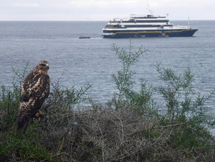 South Plaza is a small colorful islet covered with a reddish succulent plant known as sesuvium that, along with the green of the prickly pear cacti, black of the basaltic rocks, and the turquoise of the surrounding waters make for an incredible landscape. The winds blowing from the south created an updraft current on the cliff that is used by seabirds such as swallow-tailed gulls, blue-footed Boobies, frigate birds, and tropicbirds. This small islet has interesting flora- prickly pear cacti with bark, succulent plants, leather leaf, and thorny shrubs comprise the landscape of the area. Land iguanas were all over in large numbers coexisting with sea lions and today we had a special encounter with a mother and pup sea lion that was nursing. Just by our presence and observation we took in their social structure, bonding between mommy and puppy. Later on, our captain repositioned the ship as I gave a talk about Oceanic Currents and Fish Diversity of Galapagos.