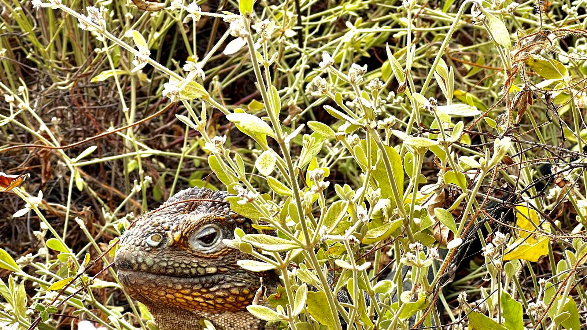 Photo caption and photographer: A Galapagos land iguana, alert and surrounded by the local vegetation of the arid zone. Photo by Paola Luque