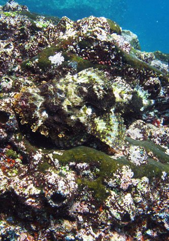 After breakfast, the ship moved a couple miles north into Buccaneer Bay, and the blue sky took over. Snorkeling! Again! Sea lions checked us out, a stone scorpionfish was found and with difficulty shown to others. Parrotfish, moorish idols and surgeonfish, damselfish, grunts, wrasses, and even a horse conch appeared—its bright red mantle standing out in contrast to the dull rock surface.