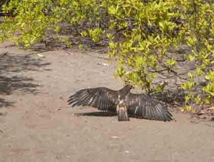 Early in the morning our guests disembarked on Espumilla Beach. The weather conditions were excellent with calm seas, soft winds and the first beams of sun illuminating the green beach, which was marked with a great number of sea turtle tracks from the previous night. Inland, the landscape changed completely. Observing giant “palo santo” trees, land birds and Galapagos hawks were flying in circles over our heads. We observed one of them landing close to us, approaching and opening its wings as if it was intentionally posing for a picture.