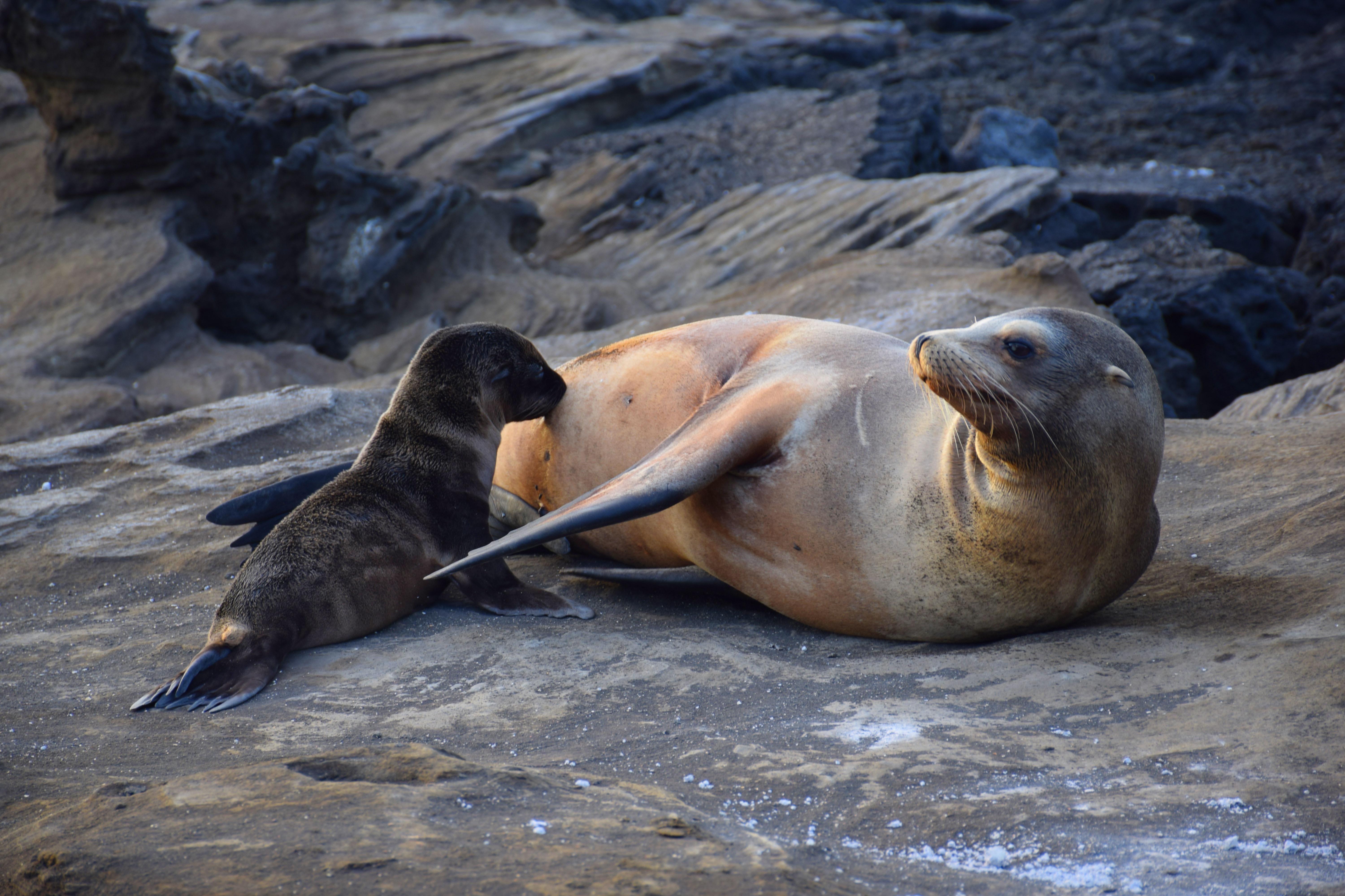 During lunch we moved to anchor at Puerto Egas. After another wet landing in the Zodiacs, we had a choice between a hike along the shoreline to look for marine iguanas, sea lions and fur seals, or to relax on the beach and have a swim or snorkel from shore. On the hike we followed the coastline and were treated to marine iguanas, Sally Lightfoot crabs, Galapagos fur seals and sea lions. As the sun was setting, the lighting was perfect for photographs as we walked over the rough, lava shoreline. A highlight was a mother sea lion suckling her pup, probably only a week or so old. We stopped to watch the sunset behind the volcanoes of Isabella in the distance.