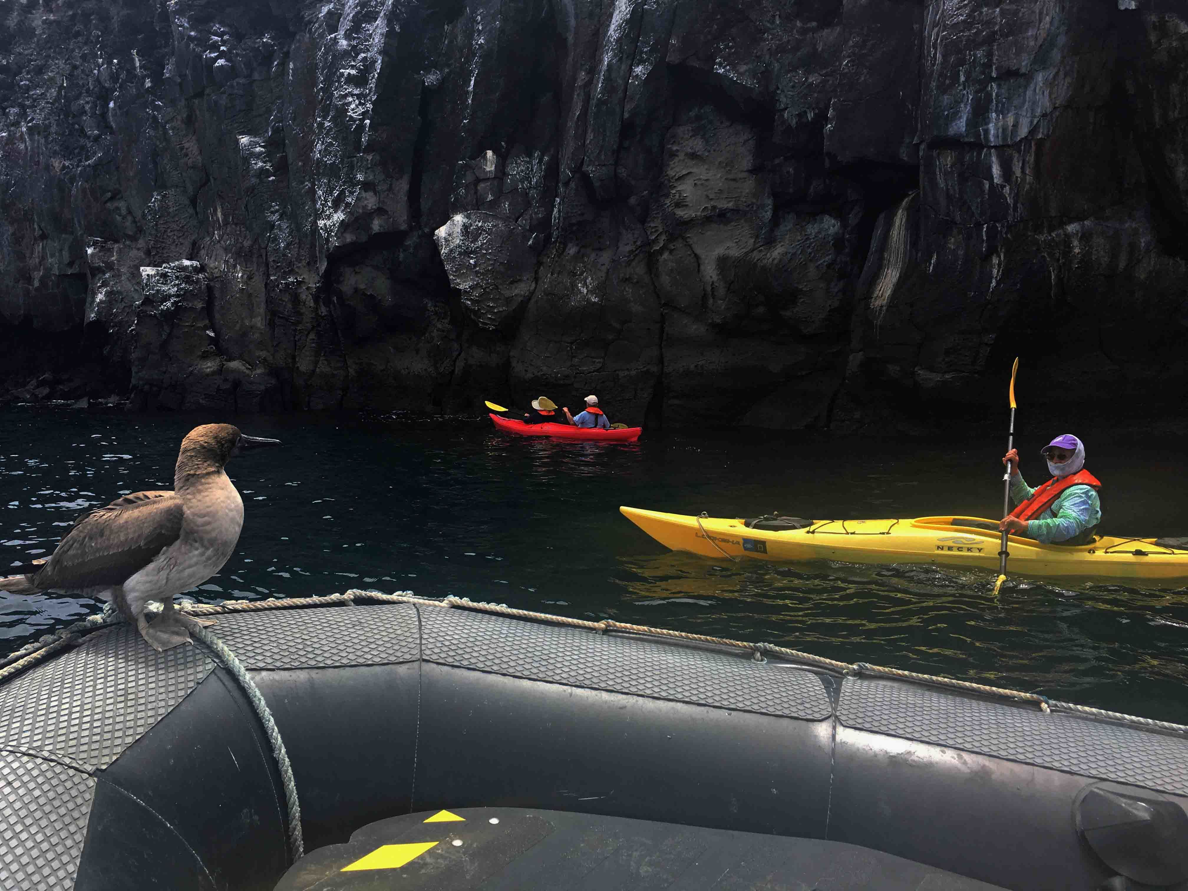 We woke up anchored inside a caldera filled with seawater. We visited two destinations where about a million seabirds live and breed. We also snorkeled and kayaked inside the caldera, the only opportunity of its kind in the Galapagos. We celebrated as we crossed the equatorial line from south to north. Sunset declared the day was over, painting the sky yellow and red. We declared it an extraordinary day of expedition.