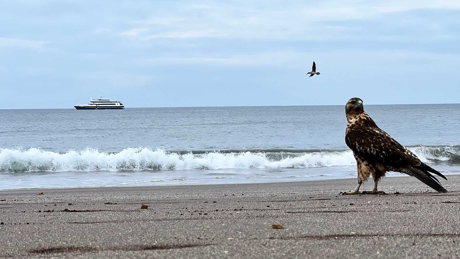 We spent our day following Charles Darwin’s steps on Santiago Island, a place he spent nine days exploring. National Geographic Islander dropped anchor at Espumilla Beach. We started early in the morning with invigorating kayaking along the shoreline and a leisurely walk on the beach. I was fortunate to lead the walk on Espumilla. We saw Pacific green sea turtles swimming very close to the shore, as well as a good number of blue-footed boobies and brown pelicans diving for fish. Along the shore, we observed Galapagos mockingbirds and yellow warblers jumping from branch to branch. A juvenile Galapagos hawk stood quietly in the button mangrove while observing us with an exhilarating curiosity and tameness. As we decided to continue our exploration, the juvenile hawk decided to follow and constantly looked to us for our attention, as if trained to do so! The hawk followed until we boarded the ship. It was a fantastic moment!
