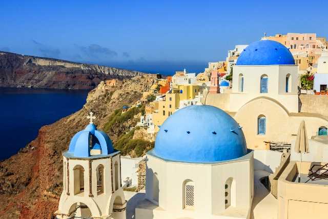 The drive through the countryside is equally breathtaking with olive and pistachio orchards and vineyards, with there characteristic low growing grape vines. Our first visit is to the north end of the island and the community of Oia, the most picturesque of all Santorini villages. This were most of the classic views of the blue domes are photographed. We spend the morning exploring the narrow streets, searching out scenic overlooks, shopping, and, of course, stopping to enjoy an iced coffee while taking in the panoramic views of the harbor below.