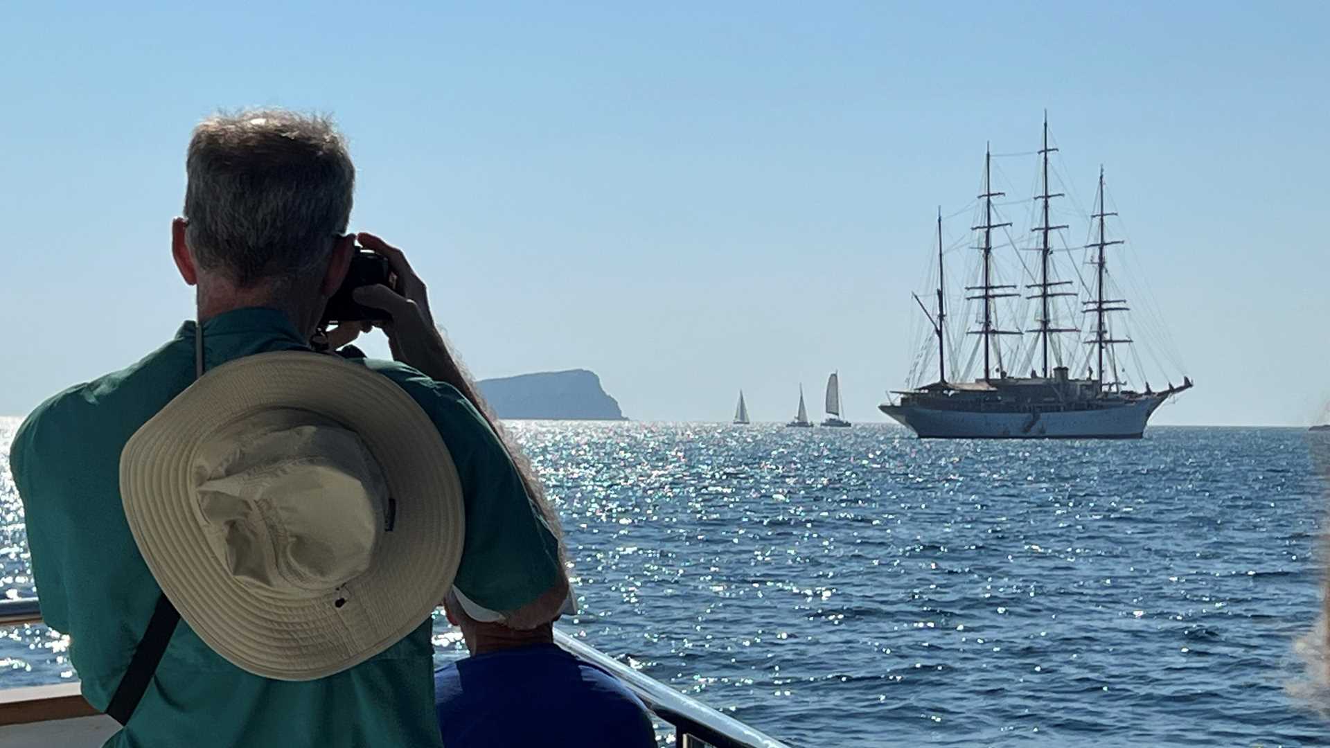 Our weeklong expedition abord Sea Cloud has taken us through a wide range of the conditions that the Cycladic Islands have to offer. Today, with calm seas, we arrived in the charming seaside town of Kamares, the chief port of Sifnos. During antiquity, this island enjoyed a period of great prosperity as they were privy to plentiful deposits of gold and silver, and the Sifnians built fantastic monuments at Panhellenic sanctuaries with their newfound wealth. By the late 6th century BC, though, these mines were exhausted, and the islanders later fell within the influence of the Athenian Empire, aka the Delian League. Traces of the Sifnians’ former wealth are evident in the blocks of carved marble, originally from temples of the Ionic Order, which have been repurposed into present-day structures. In the Middle Ages, Sifnos was part of the Byzantine Empire until the early 13th century when the Venetians wrested control of the Cyclades after the Fourth Crusade. This medieval phase of the island’s history is evident in the charming village of Kastro, where we arrived after a short bus ride from the port. Situated atop an outcrop, this fortified settlement stands aloft about 200 feet above the rocky shoreline of the Aegean Sea below. Its thick outer wall is breached by only a handful of narrow passages, while the narrow streets and staircases within it are ripe for exploration. To the east of Kastro, a beautiful little chapel with a characteristic blue dome (the Church of the Seven Martyrs) sits proudly on a peninsula against the stunning blue waters around it. Upon returning to Kamares harbor, some of us visited a sandy beach–it was time for a swim! Afterwards, we enjoyed a fantastic buffet lunch on the ship, with a special pasta bowl on offer. During the afternoon, the weather shifted, and we were once again feeling the steady stream of 20 knot winds from the north. In the evening, we gathered one last time for the Captain’s farewell drinks, and we shared our memories together with the voyage slideshow. After dinner, we got one last surprise– Sea Cloud’s crew took us through a hearty rendition of traditional sea shanties. Cheers to the (not so) drunken sailors!