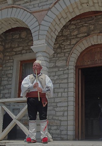 We next visited the Ottoman fortress in Sarandë built during the reign of Sulieman the Magnificent. The views from the top of the fortress were spectacular. Corfu seemed so close that one could touch it. We were treated to a selection of Albanian wines and foods. A special treat was a performance by a traditional Albanian flautist playing what appeared to be an ancient panpipe. The most curious thing about his playing was that he blew into the pipe from a hole in his teeth. The sound was quite remarkable.
