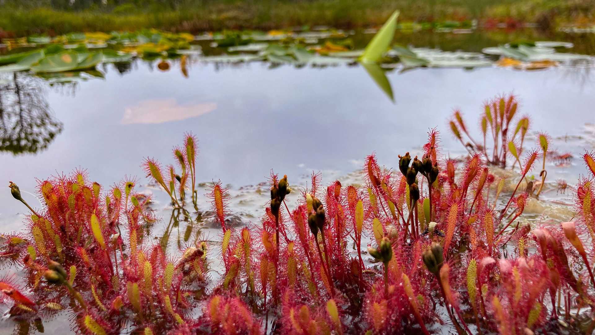 We sat down on the edge of the muskeg, an open landscape covered in soft, spongey mosses accented by scraggly shore pines and ankle-high blueberry bushes. Here and there were flooded potholes, some as small as a truck tire and others big enough to submerge a truck in, but all easily deep enough to slowly swallow a person and preserve them in the acidic, anaerobic muck. These murky sloughs were surrounded by tiny, alien-like carnivorous plants, their tiny, dew-dropped tentacles waiting for the unsuspecting fly to come too close.