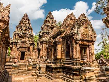 The drive out to the Banteay Srei Temple served as an introduction to our guides, to Cambodia, to Angkor, and to a mythological universe that dominated Southeast Asia for 500 years. We learned that Cambodians call their country Kampuchea, and themselves Khmer. So Khmer people live in Kampuchea, and speak Khmer with words like “Angkor,” which means “city” and “wat,” which means “temple.” Brahma and Shiva and Vishnu are the three main gods of the endless Hindu pantheon, but wait, is this Hindu or Buddhist? Theravada or Mahayana? And who or what was a Jayavarman? The names and words were as new and dizzying as the passing landscapes: stilted houses, tuk tuks, water buffalo, lotus ponds, palm sugar fruit, rattan baskets piled high as a house, on the back of a motorbike, orange-robed monks, roadside monkeys and a whirlwind of other images passing like a dream. No, we’re not in Kansas any more . . .