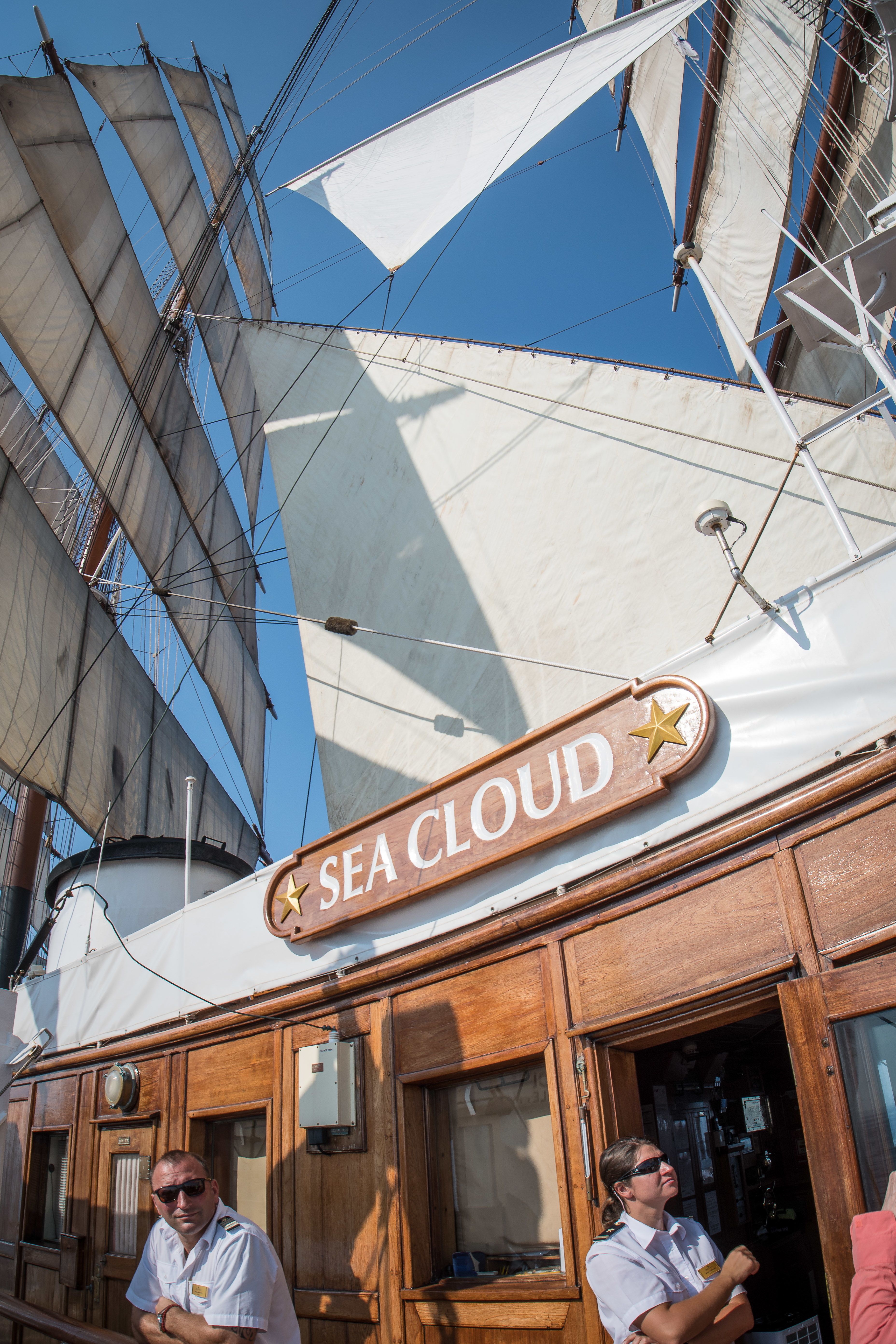 There is no defensive wall in the Castro and so the inhabitants built their homes with the rear facing outwards and since there were no windows or doors it effectively served as a continuous wall. Some of us climbed down to the majestically sited Church of the Seven Martyrs situated on a rocky headland taking the full brunt of the sea. Its brilliant white and blue dome against the cerulean sea was breathtaking. Of course we had to climb back up! There were some great pottery shops in Kamáres and a number of us made purchases. Our final destination in this tranquil harbor was the beach—soft sand and perfect water temperature. Most of us took advantage of an invigorating swim before getting a tender back to Sea Cloud. Sailors went to their stations at 2 p.m. and we were at full sail by 2:15 p.m.