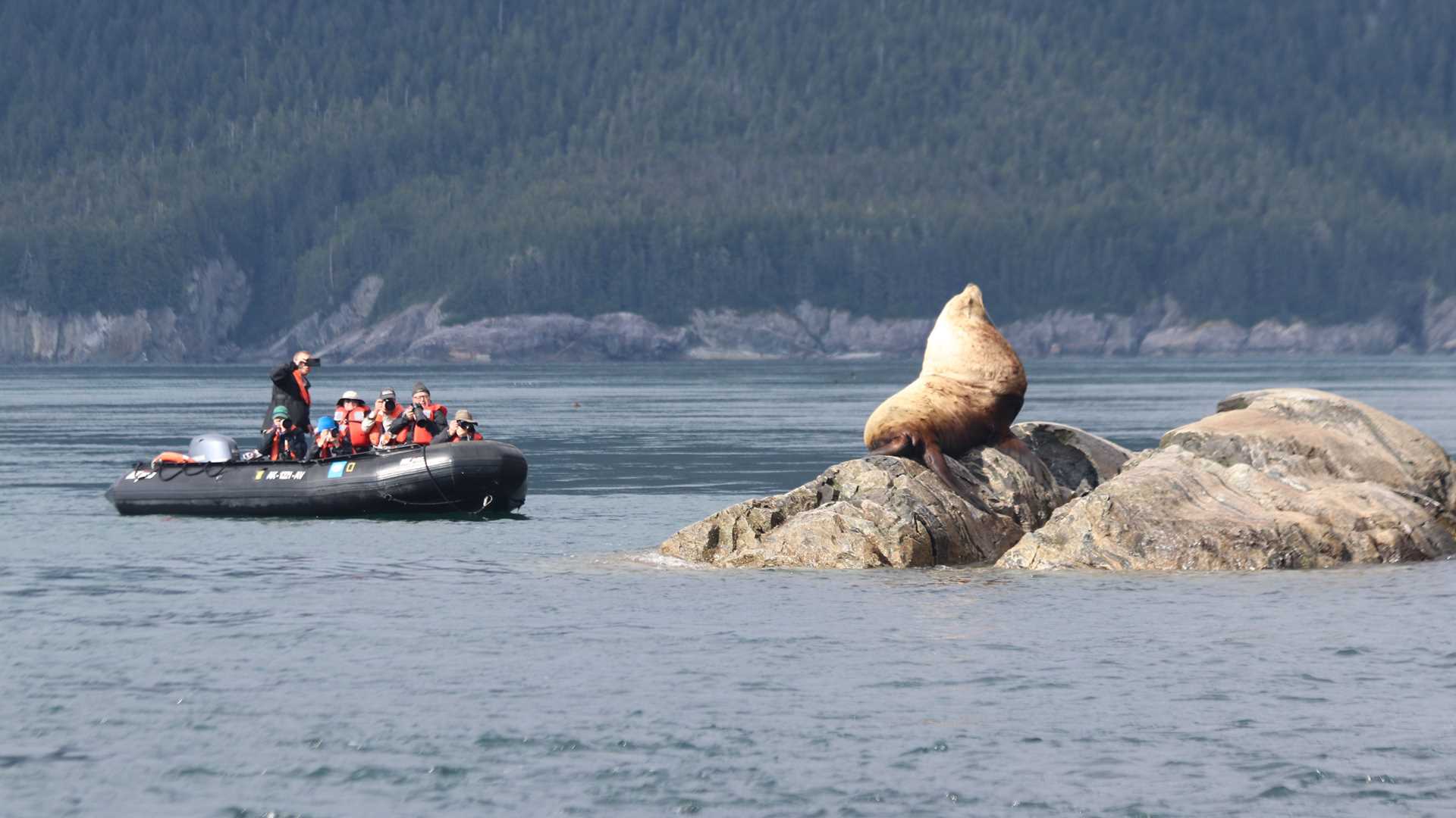 On afternoon Zodiac explorations through the Inian Islands, where a strong flood current stirred productive waters, Steller sea lions thrashed their fish meals as glaucous-wing gulls sought leftovers. Sea otters snuggled their young in the camouflage of the kelp forest canopy. Bald eagles of various age class plumages glided along the cliffs and perched in trees that precariously clung to the island’s flanks. Red rockfish with bulging eyes floated sideways on the surface, having lost out to pressure control issues in turbulent upwelling waters, becoming easy meals for sea lions. A peregrine falcon zipped by as we enjoyed long views out to the Gulf of Alaska on this stellar day.