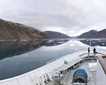 Although we have crossed the political boundary that separates Canada from neighboring Greenland, we still looked out upon the mountains of Ellesmere Island. To the east, huge blue icebergs glided along the Greenlandic shore. Like polar explorers who have gone before, we strove to see just how far north we could go, and for most of the morning open water encouraged our endeavor. Gradually, scattered floes gave way to giant icy platters patterned with turquoise pools and rivulets. By midday they had coalesced, driven by wind and currents, and we could progress no further.