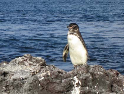 After breakfast, we started our morning by exploring the shore from our Zodiacs. We visited the small channel that separates Chinese Hat from Santiago with the mission of locating some penguins. Success! We observed several penguins on the rocks and others swimming in a feeding frenzy trying to catch some mullets. Meanwhile, on the lava shores, marine iguanas, lava herons and crabs delighted our guests. We crossed to the shallows of Chinese Hat, where several great blue herons hunted for fish or crabs and some cute sea lions sunned themselves on the white beach, all of us observed by a Galapagos hawk perched on the rocks.