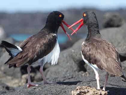 With a “panguero” and naturalist in each Zodiac, we admired the extensive lava flow on island of Santiago that dates from 1897. Sharp-eyed guest Marea spotted a penguin swimming in the distance and we motored along behind it as it sped through the turquoise water! Later that same flightless bird swam among all the Zodiacs so everyone was able to catch a quick glimpse of a Galapagos penguin. There were lava herons (also known as striated herons, but many of us prefer their previous common name!) fishing, and marine iguanas sunning. I pointed out the amazing endemic Galapagos tomato plant—it is adapted to this salty arid zone and being studied for possible use in domestic plant research by a direct descendant of Charles Darwin!