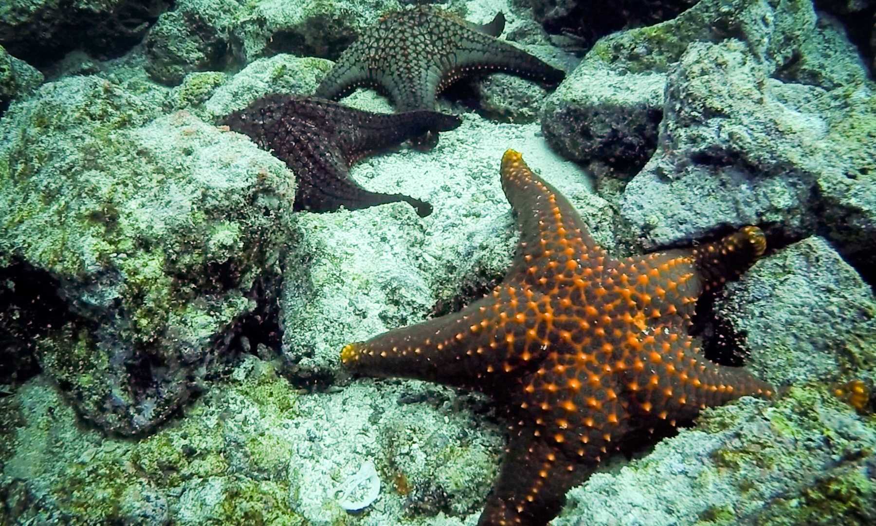 Back on board we wiggled into our wet suits for snorkeling from the Zodiacs in the turquoise channel between Sombrero Chino and Santiago. Three Zodiacs with naturalists headed out each one full of eager snorkelers, and they were not disappointed with this late morning outing! The water was chilly but very clear and we swam among thousands of fish or dozens of different species. We spotted huge sea stars on the rocks and on the white sand bottom and many of us saw a white tipped reef shark!