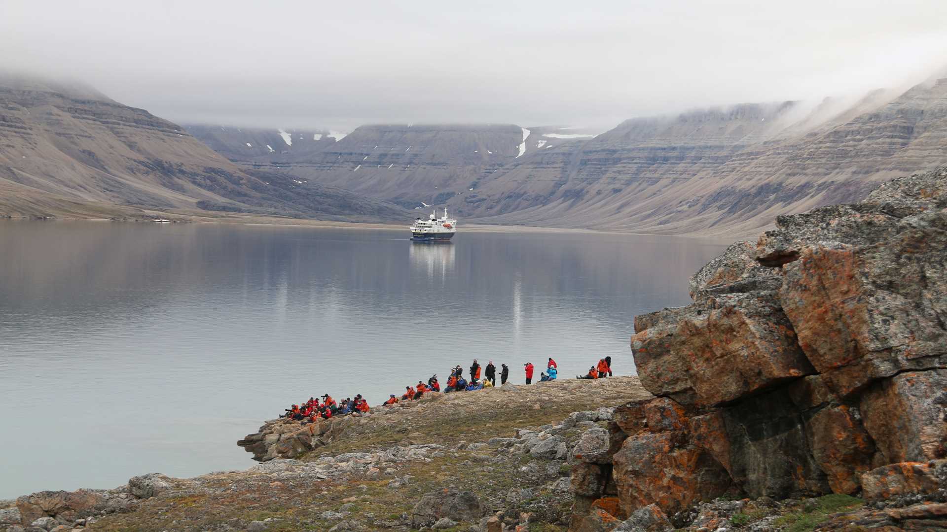 After a few hours of exploring the area, we boarded the National Geographic Explorer and headed east to Cuming Inlet, another area that remains largely unexplored. Here the landscape is dramatic, with an unnamed tongue of the inland ice cap flowing down the valley it has carved to reach the sea. We kept an eye out for wildlife as we slowly motored past and soon our efforts were rewarded as we spotted a few dozen walrus hauled out on the rocky shore. We were careful to keep a good distance with the ship to avoid spooking them, then landed half a mile from them to try and get a closer look. Working our way slowly and quietly along the beach, we managed to approach to within 600 feet without disturbing them. We watched as several more hauled themselves ashore and we could clearly hear them grunting as they argued about who got to sit next to whom, and who stepped on whose flippers. Not only could we see and hear them, but when the wind shifted a bit, we could also smell them! These may now be the most photographed walrus in Nunavut!
