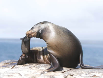 The National Geographic Islander sailed overnight around the eastern side of Santa Cruz to the small satellite island of South Plaza where we ventured after breakfast. Although small, South Plaza has a particularly high density of the Galápagos land iguana Conolophus subcristatus. The animals comprising this population are the smallest known in the species, and we saw many of them, basking in the morning sun to raise their body temperature above 30 degrees Celsius when they will begin foraging. We saw a few territorial battles between males, with the characteristic head-bobbing followed by one animal chasing the other at surprising speed. Fights between large and closely sized males may last over an hour and involve head-butting and biting; older males bear numerous neck scars as testament to their past travails.