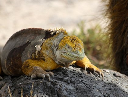 South Plaza is one of the islets that lie off the eastern coast of the larger island of Santa Cruz.  Both islets, North Plaza and South Plaza, are the result of geological uplift which took place over a million years ago, but only the southern island is open to visitors. South Plaza is home to one of the healthiest remaining land iguana populations in Galápagos. On this small islet, their territories overlap with those of the marine iguanas, and the two separate species have been known to interbreed here, and create a non-viable hybrid which can sometimes be seen during a visit. In the past, some populations of land iguanas have been almost wiped out by feral dogs, but thanks to a successful captive and semi-captive breeding program run by the CDF and GNPS, these endangered populations were able to recover.