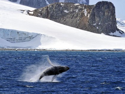 Soon, icebergs came into view, caught on the shallow shelf of the South Shetland Islands. Then, behind the icebergs and towering above them, came our first sighting of snow- and ice-covered peaks. Our course took us between Greenwich and Roberts islands, through English Strait. Here a young humpback whale put on a most incredible show by throwing its entire body from the water, again and again, in a series of breaches. We can't be sure just why the whales choose to leave their ocean domain, if only briefly, but that takes nothing from our joy of witnessing the behavior.