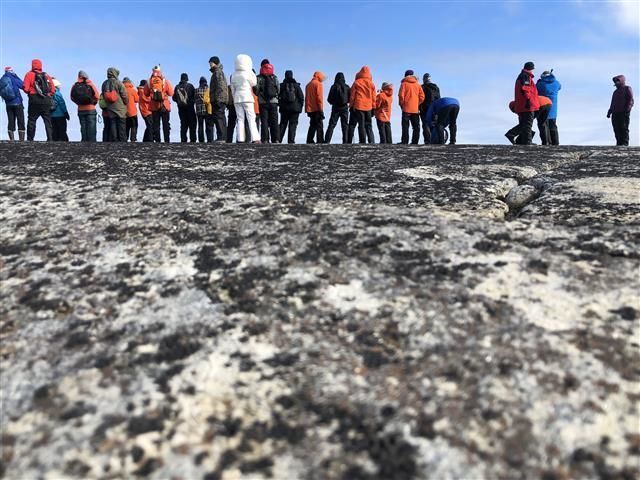 During lunch, the weather turned a little and the wind kicked up, but not enough to stop us as we headed out in Zodiacs to land on the rocks of Boltodden. Once landed, there was a surprise: a perfect set of dinosaur footprints? Set into the sandstone, the prints—about 30x30 centimeters—looked as through the animal had walked over the beach just hours ago.