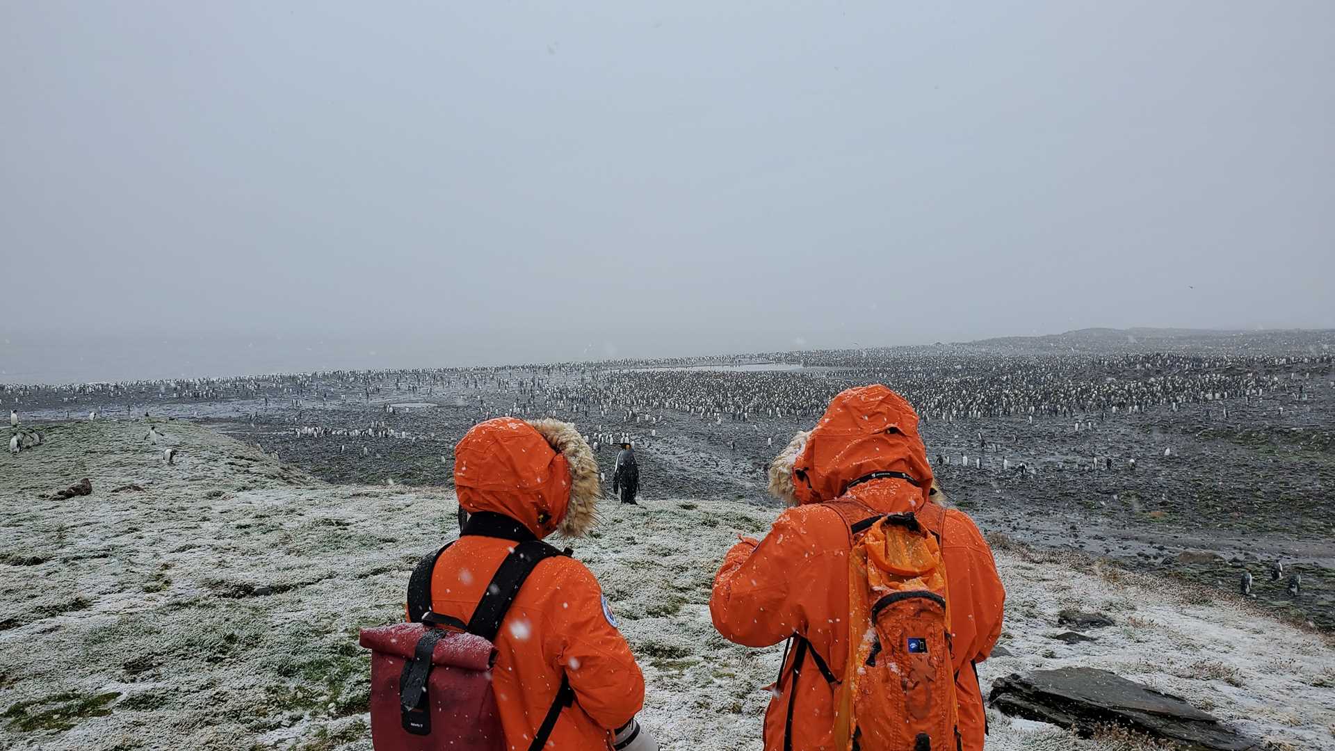 Our destination for the morning proved utterly beautiful. The green rolling hills, hanging glaciers, and wildlife were met with a small flurry of snow. This drastic change in the weather from yesterday provided a deep sense of respect for South Georgia and the life she brings. A light jaunt was in order for the morning, and we saw many young Antarctic fur seals running and roughhousing between the rolling hills. Snow fell lightly as our guests witnessed the largest colony of king penguins on the planet – over 250,000 breeding pairs!